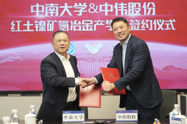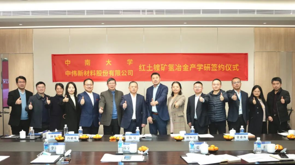 2023年1月9日上午,中南大學與中偉股份紅土鎳礦氫冶金產學研合作成功簽約。中南大學副校長郭學益,科學研究部部長李啟厚,冶金與環境學院副院長陳愛良,資源循環研究院副院長王親猛、童匯、李棟,科學研究部王李昌,中偉股份資深副總裁陶吳,高級副總裁兼董事會秘書廖恒星,首席專家馮德茂,總裁辦主任張惠海等領導出席見證簽約儀式。