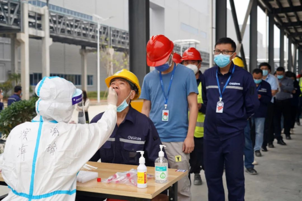 與此同時,基地嚴格要求進入廠區人員全天佩戴口罩、接受體溫檢測、兩碼核對,積極與政府部門對接,在公司設立核酸檢測點,每日組織全員核酸檢測工作,確保防疫、生產兩不誤。在這場沒有硝煙的疫情防控阻擊戰中,南部產業基地涌現出了一批奮戰在抗疫一線的“逆行者”,這支由公司黨員組成的志愿先鋒隊主動請纓,協助醫務人員完成核酸檢測信息錄入等相關工作。在9天的時間里,他們奮戰在核酸檢測一線,每天輔助核酸檢測4000余人/次,憑借積極主動、細致熱忱、調度高效的服務,得到了醫護人員和全體員工的一致稱贊。