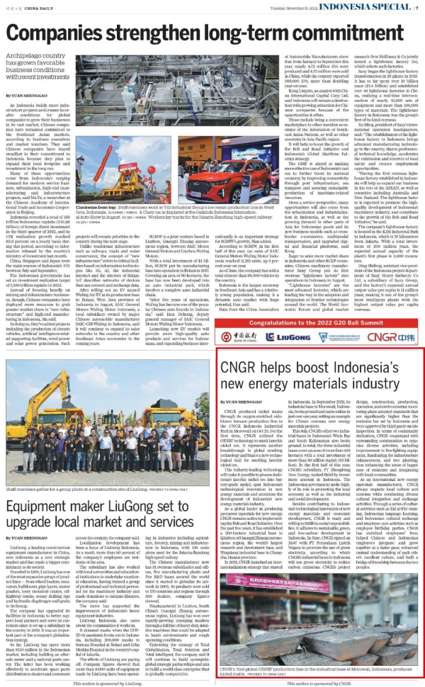 作為國家英文日報,中國日報(China Daily)在11月15日當天發行的G20特刊中,聚焦中偉在印尼的產業發展,用四分之一版面大幅刊登題為《CNGR helps boost Indonesia's new energy materials industry》(中偉助力印尼新能源材料產業發展)的重點報道。